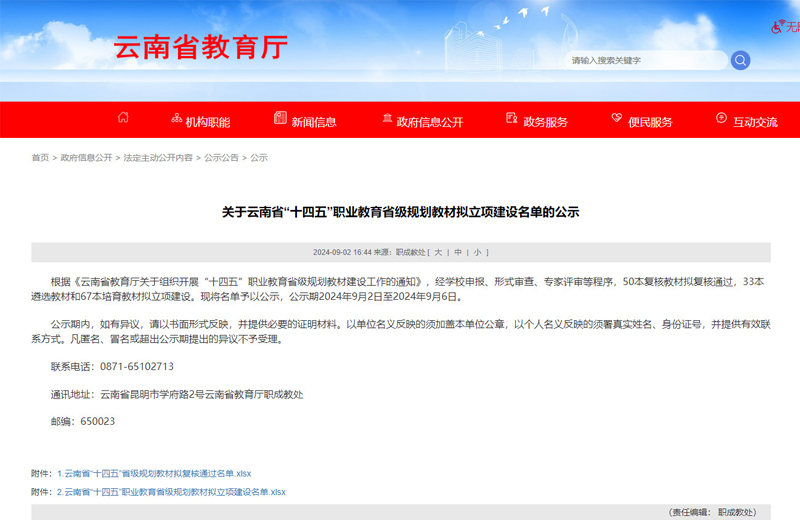 近日,云南省教育厅公示,世界杯官网二本教材入选云南省“十四五”职业教育省级规划教材拟立项建设名单。