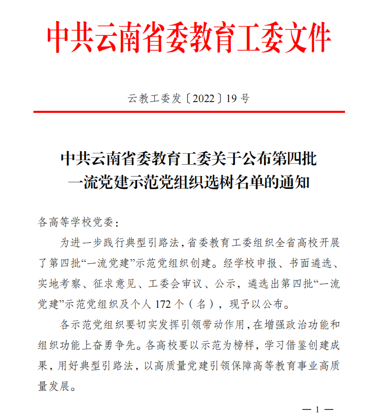 近日,省委教育工委公布了云南省第四批高校“一流党建”示范党组织选树名单,学校护理学院第一党支部与医学康复学院第二党支部被选树为“一流党建”示范党支部。“一流党建”示范项目创建是按照云南省创建高校一流党建工作安排...