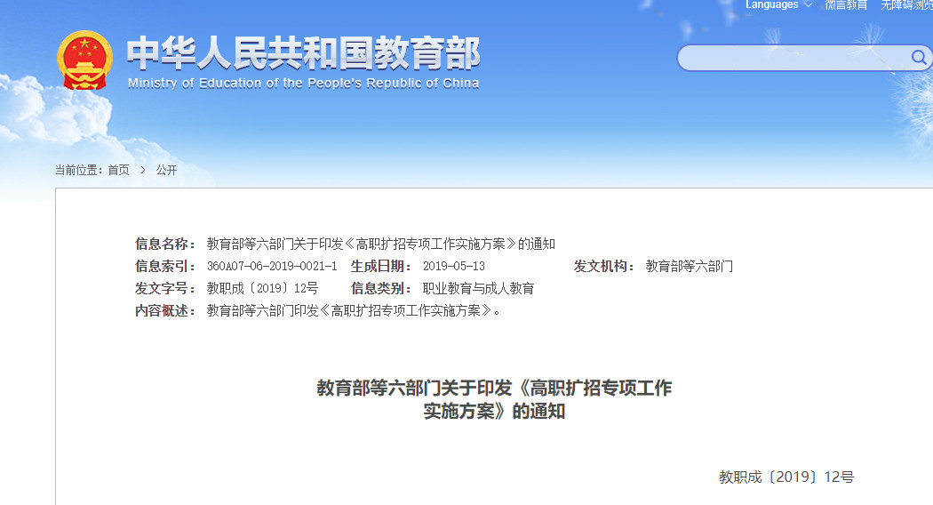 教育部等六部门关于印发《高职扩招专项工作实施方案》...