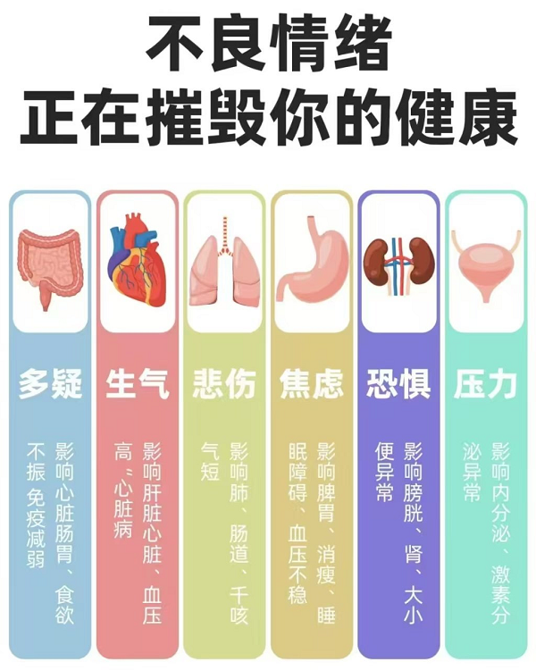 情绪与五脏六腑的关系在中医理论中被称为“情志内伤”。中医认为,七情(喜、怒、忧、思、悲、恐、惊)过度会直接影响对应脏腑的气血运行,导致功能失调,甚至引发疾病。例如,喜伤心、怒伤肝、思伤脾、忧伤肺、恐伤肾在中医看...