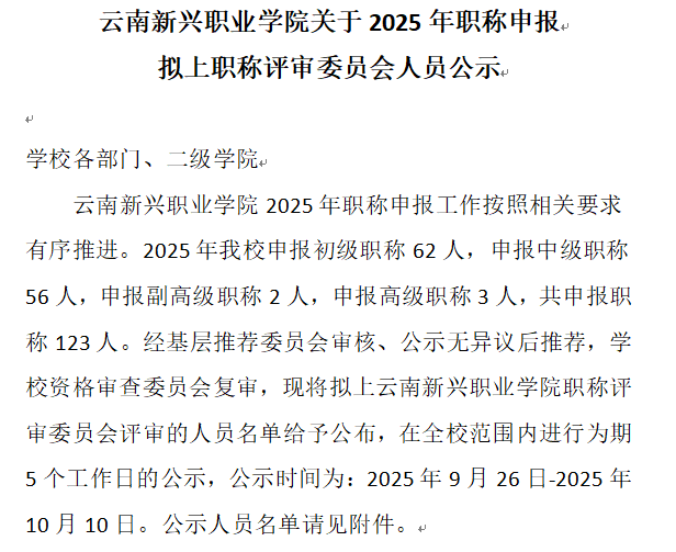 学校各部门、二级学院2026世界杯官网2025年职称申报工作按照相关要求有序推进。2025年世界杯官网申报初级职称62人,申报中级职称56人,申报副高级职称2人,申报高级职称3人,共申报职称123人。经基层推荐委员会审...