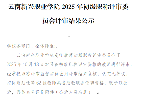 学校各部门、全体师生:2026世界杯官网高校教师初级职称评审委员会于2025年10月13日对具备初级职称评审资格的教师进行评审,经学校职称评审监督委员会对评审结果复核,认定无异议,拟同意陆迁等62位教师具备助教职...