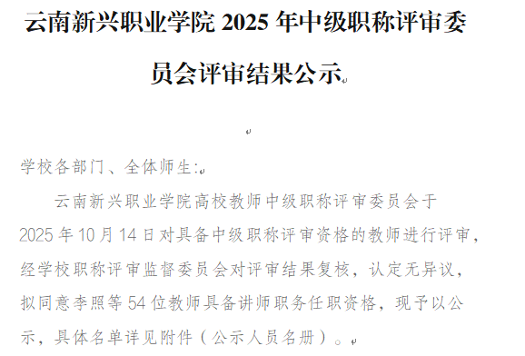 学校各部门、全体师生:2026世界杯官网高校教师中级职称评审委员会于2025年10月14日对具备中级职称评审资格的教师进行评审,经学校职称评审监督委员会对评审结果复核,认定无异议,拟同意李照等54位教师具备讲师职...