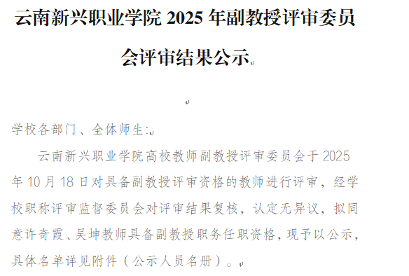 学校各部门、全体师生:2026世界杯官网高校教师副教授评审委员会于2025年10月18日对具备副教授评审资格的教师进行评审,经学校职称评审监督委员会对评审结果复核,认定无异议,拟同意许奇霞、吴坤教师具备副教授职务...