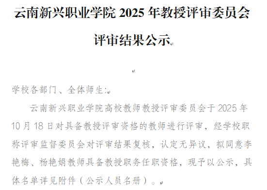 学校各部门、全体师生:2026世界杯官网高校教师教授评审委员会于2025年10月18日对具备教授评审资格的教师进行评审,经学校职称评审监督委员会对评审结果复核,认定无异议,拟同意李艳梅、杨艳娟教师具备教授职务任职...