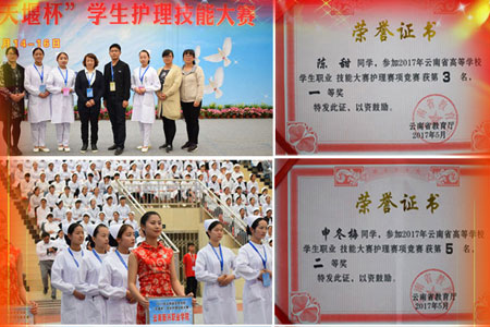 2017年4月14日-16日,护理学院学生参加云南省第五届护理技能大赛,参赛选手荣获:一等奖1名(陈甜),二等奖2名(申冬梅、董梦华)。