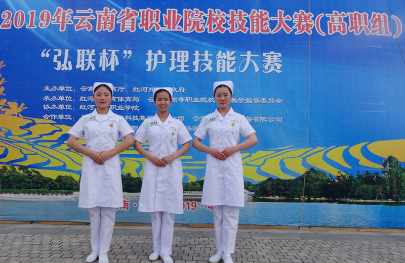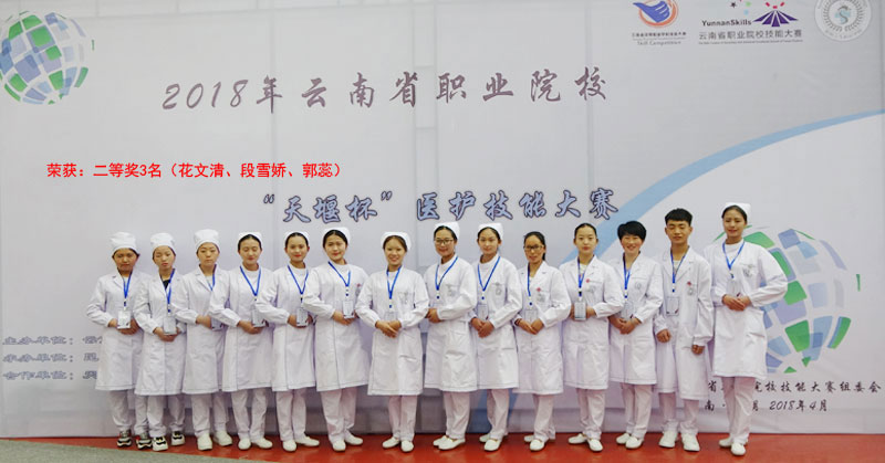 护理学院学生参加2018年云南省职业院校“天堰杯”医护技能大赛,三名学生(花文清、段雪娇、郭蕊)荣获二等奖。并代表云南省参加2018年全国职业院校护理技能大赛。