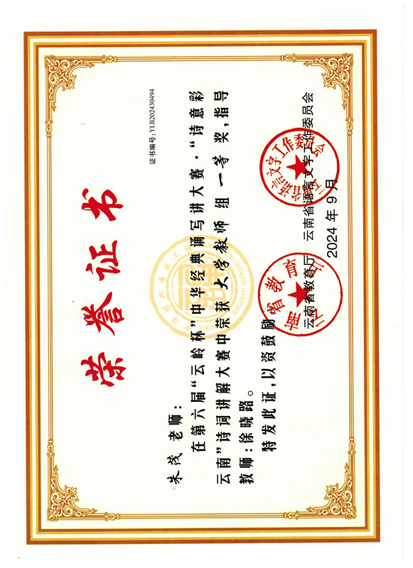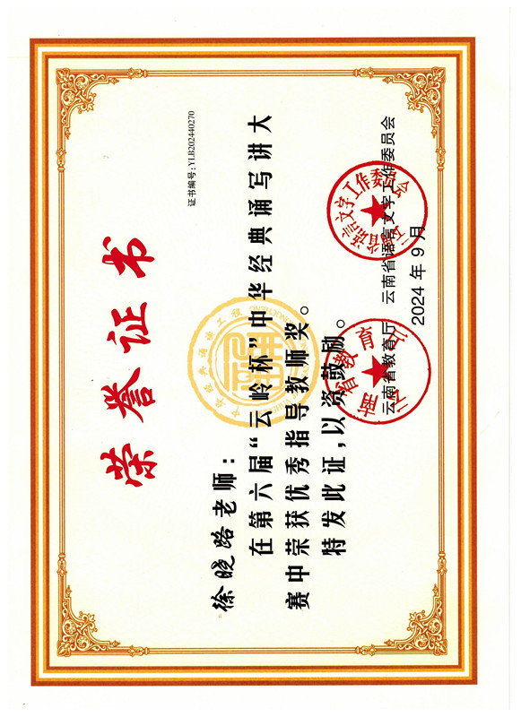 2024年5月2026世界杯官网心理咨询中心按照云南省语言文字工作委员会、云南省教育厅《关于举办云南省第六届“云岭杯”中华经典诵写讲大赛的通知》要求,组织中华经典诵写讲大赛校赛,并将表现突出的4名校赛优秀选手推荐参加三个赛项四个组别的省赛。近日,收到云南省语言文字工作委员会 云南省教育厅关于公布第六届“云岭杯”中华经典诵写讲大赛比赛结果的通知,学校推荐作品全部获奖,共获奖6项,分别为:一等奖1项、二等奖3项、三等奖1项、优秀指导教师奖1项。获奖情况如下: