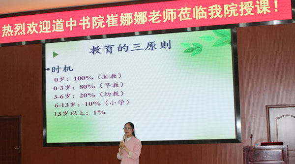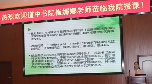 崔娜娜老师首先说明了德才兼备的重要性,同时告诉处在这样一个高速发展社会中的学子们应该把自己当作祖国未来的希望来培养自己,要勇于担起身上的责任,努力实践“今天我以学校为荣,明天学校以我为荣”的箴言。古人云:“腹有诗书气自华”,只要饱读诗书,学有所成,气质才华自然横溢。中国的经典是不受时间和空间限制的,历经了中华上下五千年的考验而名冠世界,我们应该珍惜老祖宗的留下的精华,多读经典,为以后做铺垫。崔娜娜老师表示,生命是一长串的积累,看似简单的读书,其实对各学科都有帮助,要像竹子一样有扎根精神。同时讲解了诵读经典的方法:以读为主,听为辅,以不讲解为妙。