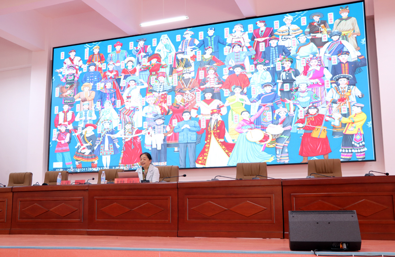 李若青教授围绕“中国历史及民族发展历程”“铸牢中化民族共同体意识的相关概念”“中华民族历史观的内涵与意义”“新时代铸牢中华民族共同体意识的行动指南”“新时代铸牢中华民族共同体意识的云南成效、云南举措”“新时代铸牢中华民族共同体意识的突破口”“新时代学校铸牢中华民族共同体意识的行动原则、行动目标、具体行动、学校保障”等方面,系统阐述了铸牢中华民族共同体意识的历史逻辑、理论意义和实践路径。她结合云南多民族聚居的省情特点,强调高校在推进民族团结进步教育中的重要作用,引导广大教职工深刻理解“中华民族一家亲、同心共筑中国梦”的深刻内涵。