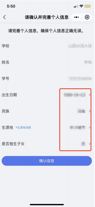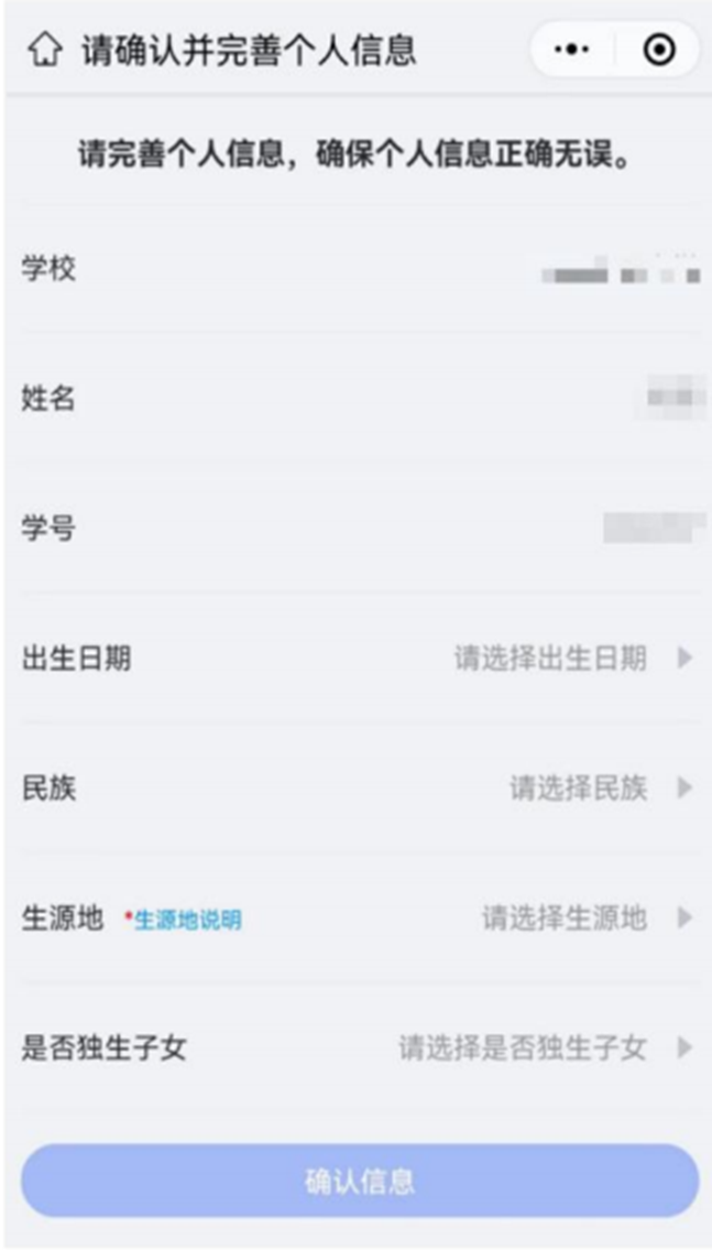 登录后完善个人信息,根据页面提示,完善出生日期、民族、生源地、是否独生子女,确认无误后点击“确认信息”。如下图: