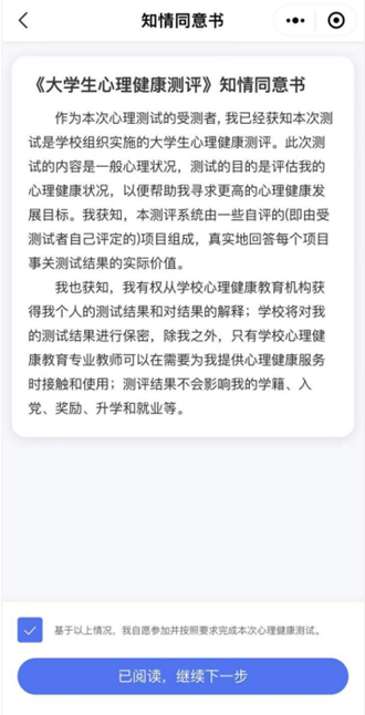 点击“开始测评”,阅读“知情同意书”,勾选“基于以上情况,我自愿参加并按照要求完成本次心理健康测试”,点击“已阅读,继续下一步”。如下图: