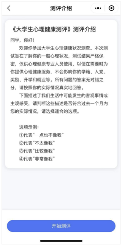 本次测评旨在了解你的一般心理状况,测试结果严格保密,仅供心理健康专业人员使用,以便在需要时为你提供心理健康服务,不会影响你的学习、入党、奖惩、升学和就业等,所有问题的答案无对错之分,请按照你的实际情况真实的回答。