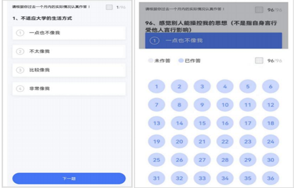 测评共有96道题,不限制作答时间,学生要根据自身真实情况作答。页面右上角提供答题卡功能,可以查看答题是否遗漏,96道题全部作答,方可提交测评。如下图: