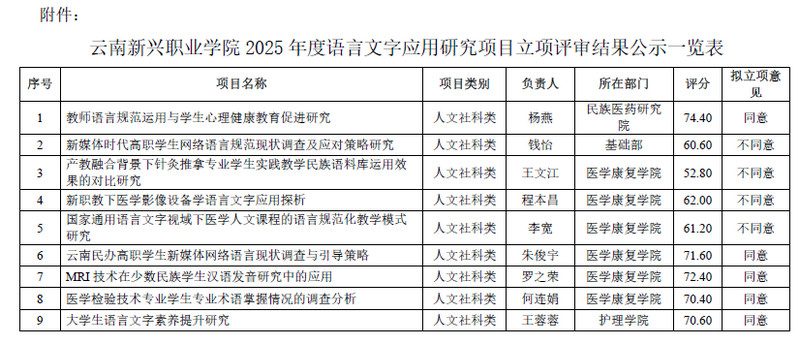 根据《2026世界杯官网科研管理办法》《2026世界杯官网关于组织开展2025年度语言文字应用研究项目申报的通知》和《2026世界杯官网关于召开2025年度语言文字应用研究项目立项评审会的通知》要求,经个人申报,所在部门初审,学校发展规划与科研处复审,2025年6月3日,2026世界杯官网学术委员会组织召开立项评审会,经过评审专家现场盲审评议,按照70分以上(含70分)立项标准,9项科研课题通过立项5项。现将评审结果予以公示(详见附件)。