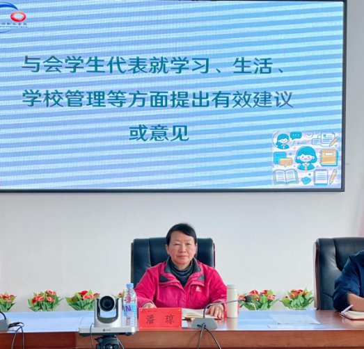 会议最后,校长潘琼作总结发言。她对全体学生代表积极参与校园建设、主动建言献策的行为表示充分肯定和感谢,强调学生是学校的主体,学校始终坚持以学生为中心,把服务学生成长、解决学生难题作为各项工作的出发点和落脚点。针对本次座谈会收集到的所有问题,要求各职能部门迅速梳理汇总,制定详细的问题整改清单,明确整改责任、整改措施和完成时限,做到件件有回应、事事有着落。同时,她提出具体工作要求:一是要持续深化 “三育人” 理念,将服务育人、管理育人、教育育人融入校园工作的方方面面,切实提升办学服务水平;二是要畅通学生问题正确反映渠道,建立常态化一线调研机制,定期深入学生群体了解实际需求,及时解决学生急难愁盼问题;三是要加强学风、教风建设,优化课程体系,完善学生技能大赛培育机制,强化教师巡查课制度,全面提升教育教学质量;四是要狠抓校园卫生管理,严厉整治卫生间抽烟等不文明行为,引导学生树立良好的个人卫生和集体卫生意识,培育劳动精神;五是要优化食堂运营管理,丰富菜品种类、保障餐饮卫生,改善学生就餐体验;六是要加强宿舍精细化管理,为学生营造舒适安全的住宿环境;七是要做好评优评选与宣传,发挥优秀学生代表的模范表率作用,营造比学赶超的良好校园氛围;八是要以此次座谈会为契机,推动各项工作改革创新,切实提升学校管理和服务效能,让全体学生能够在校园里开开心心学习、健康快乐成长。