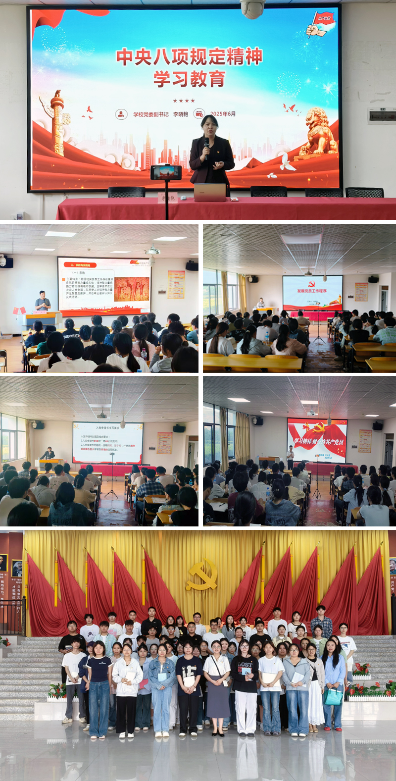 党委副书记、党校副校长李晓艳同志通过专题辅导,深入浅出地讲解了中央八项规定精神,引导学员们树立正确的纪律观念和规矩意识;马克思主义学院党支部书记、院长晏涛同志专题领学了党的二十届三中全会精神;党委统战部部长、组织部副部长张万志同志围绕“正确认识和看待宗教,争做新时代合格的共产党员”进行了深入讲解,增强了学员们的民族自豪感意识和民族宗教政策的理解把握;党委组织部部长、党校办公室主任汪文煌同志分享了身边优秀共产党员的先进事迹,激励学员们以实际行动践行党的宗旨,永葆党的先进性;专职组织员(赵雨欣、杨晓君、何付强)在培训过程中,详细讲解了发展党员流程步骤及相关文书写作,使学员们对党员发展工作有了更为清晰的认识;长征教育学院胡左娟老师带领学员们参观了校园红色文化展馆,通过实地参观和聆听讲解,使学员们深刻感受到了革命先烈的英勇事迹和崇高精神。