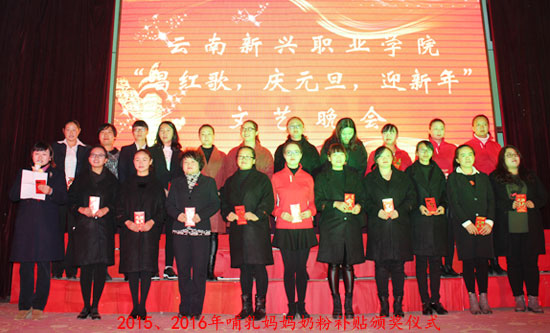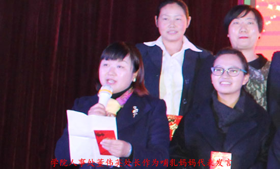 在晚会中还有一个特别的环节,那就是为来自学校各岗位的哺乳妈妈颁发2015-2016年的奶粉补贴。她们其中有基层工作人员、有骨干教师、有中层干部……她们不仅是职业女性,同时也为人母、为人妻、为人媳,在扛起事业的同时,还要扮演好家庭中的角色。学院人事处董伟英处长作为哺乳妈妈代表,她说:“作为新兴的女职工,我们是幸福的,是自豪的,学校不仅为我们提供了施展才华的平台,还给了比男同胞更多的关心与支持。”学院对职工的关心无微不至,从煮奶锅、套装碗筷到高档蒸锅,从四件套到高级被芯……员工从中感到无限温暖,这一切都源于学院深厚的文化底蕴,“以人为本”的治校方针。