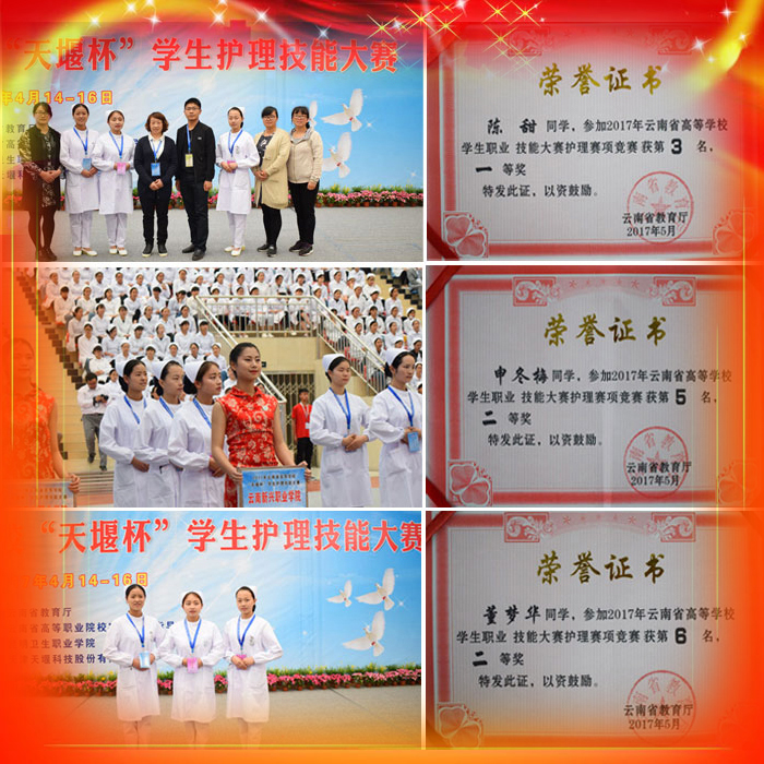 2017年4月14日-16日,学院护理系学生参加云南省第五届护理技能大赛,参赛选手荣获:一等奖1名(陈甜),二等奖2名(申冬梅、董梦华)。