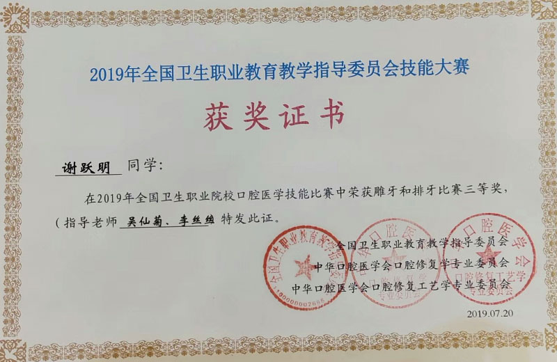 本次大赛于2019年7月20日在山东省枣庄职业学院举行,参赛选手分别来自全国76所本科、高职大专、中专院校,共计196人参加比赛。在学院各位领导的大力支持、指导教师的精心教导、参赛选手的辛苦付出下,世界杯官网谢跃明同学荣获雕牙和排牙比赛三等奖,游忠琴同学荣获CAD修复体设计组技能大赛二等奖。