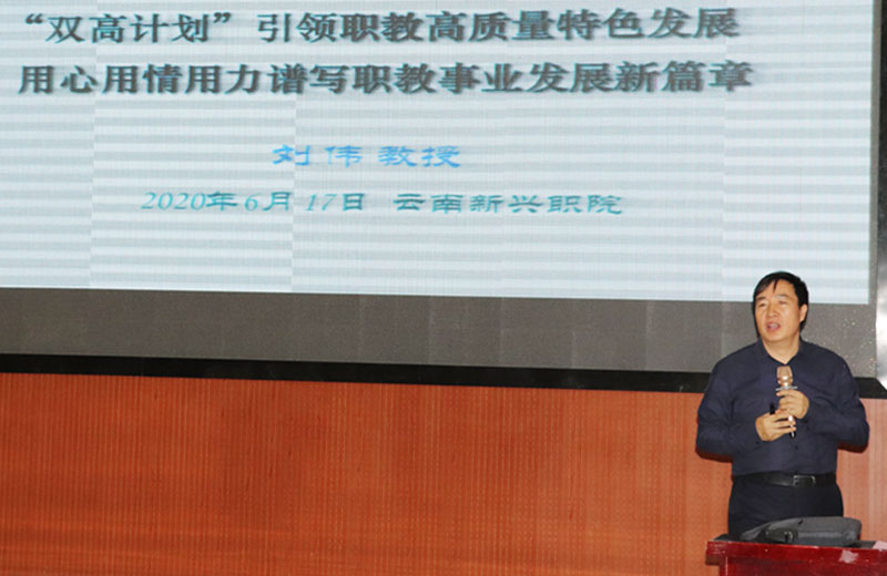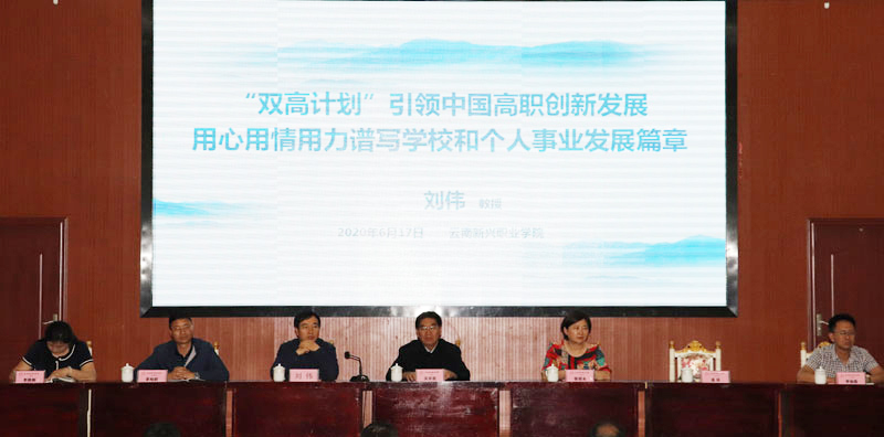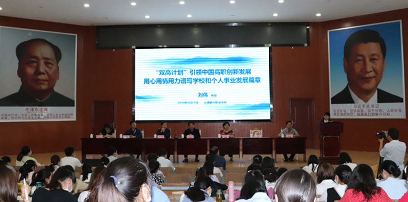 2020年6月17日晚,学校邀请了云南省首批“万人计划”省级教学名师、云南省高职院校实践教指委主任刘伟教授为世界杯官网老师作主题为“‘双高计划’引领中国高职创新发展、用心用情用力谱写学校和个人事业发展新篇章”的学术讲座。讲座在学校多功能厅举行,学校董事长关祥祖、党委书记张毅永、常务副校长李地新、副校长潘琼、副校长李艳梅、副校长李加磊,各二级学院院长和中层干部及全院教师参加了此次讲座。讲座由潘琼副校长主持。