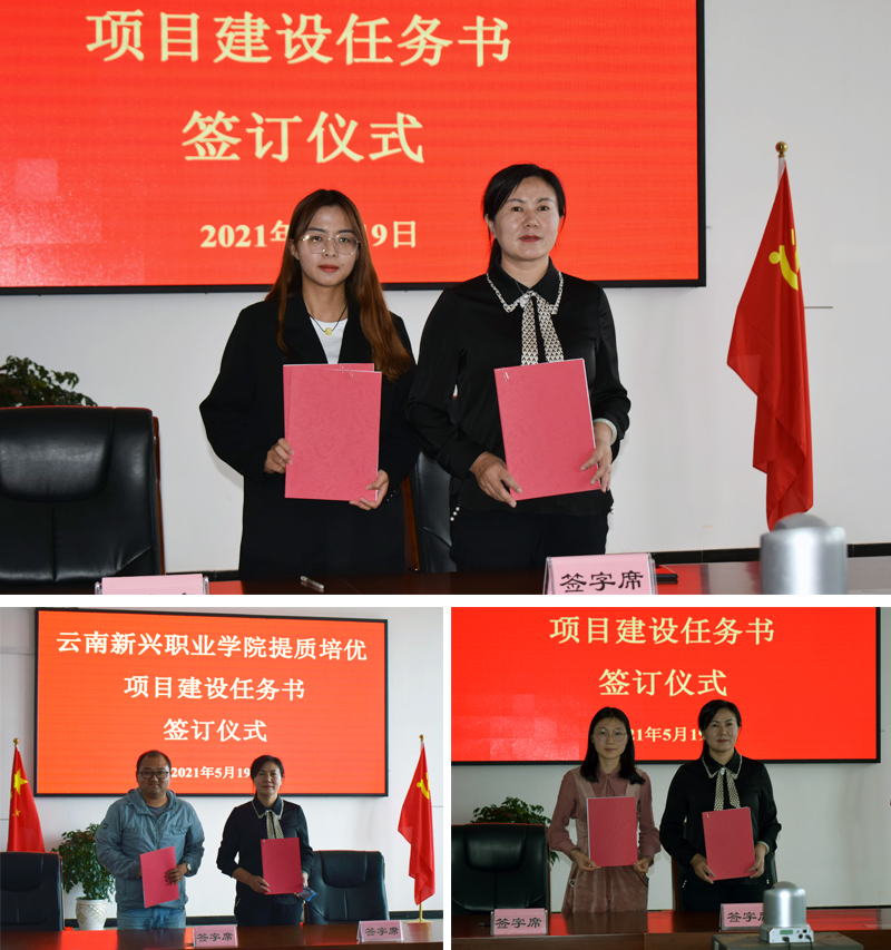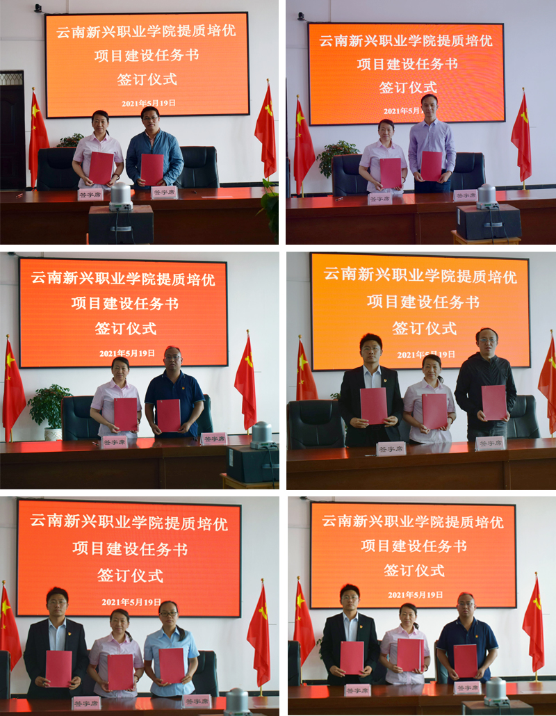潘副副校长分别与建设高水平高职学校、课程思政建设、产教融合实训基地建设、“双师型”教师培养培训基地、教学名师培育计划、校企双元合作开发职业教育规划教材、职业教育“课堂革命”典型案例、虚拟仿真实训基地、职业教育精品在线开放课程等8个项目的相关部门负责签订项目建设任务书。