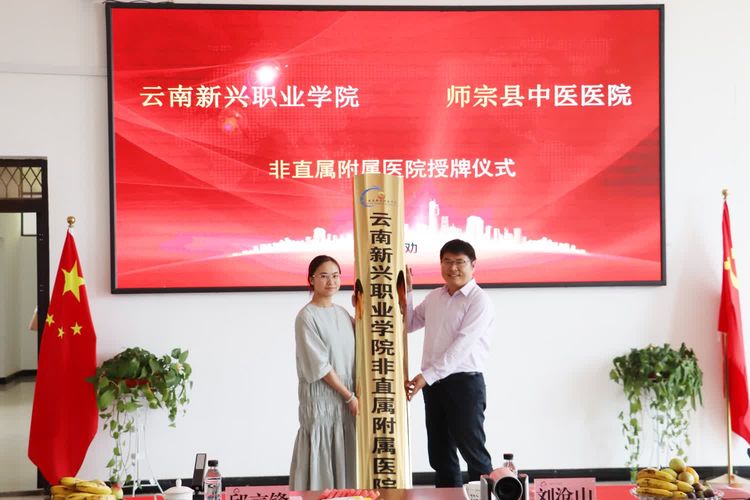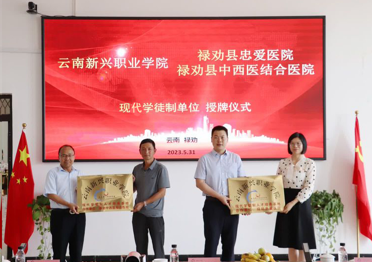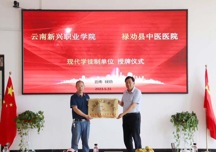 ▲刘沧山校长为现代学徒制、非直属附属医院禄劝县中医院授牌