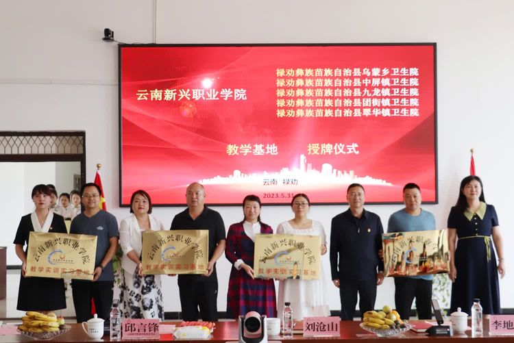 ▲副校长李地新、潘琼、杨亚梅、李艳梅、李晓艳为禄劝彝族苗族自治县乌蒙乡卫生院(教学基地)、禄劝彝族苗族自治县中屏镇卫生院(教学基地)、禄劝彝族苗族自治县九龙镇卫生院(教学基地)、禄劝彝族苗族自治县团街镇卫生院(教学基地)、禄劝彝族苗族自治县翠华镇卫生院(教学基地)授牌。