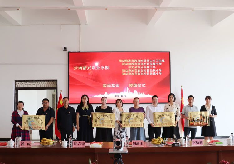 ▲副校长李地新、潘琼、杨亚梅、李艳梅、李晓艳为禄劝彝族苗族自治县雪山乡卫生院(教学基地)、禄劝彝族苗族自治县民族中学(教学基地)、禄劝县西点实验中学(教学基地)、禄劝彝族苗族自治县民族小学(教学基地)、禄劝彝族苗族自治县崇德小学(教学基地)授牌。