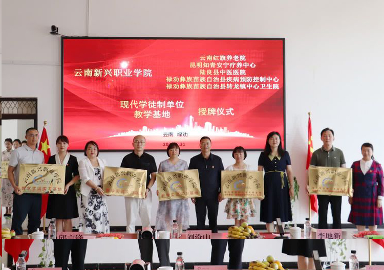 ▲副校长李地新、潘琼、杨亚梅、李艳梅、李晓艳为云南红旗养老院(现代学徒制)、昆明知青安宁疗护中心(现代学徒制)、陆良县中医医院(教学基地)、禄劝彝族苗族自治县疾病预防控制中心(教学基地)、禄劝彝族苗族自治县转龙镇中心卫生院(教学基地)授牌。